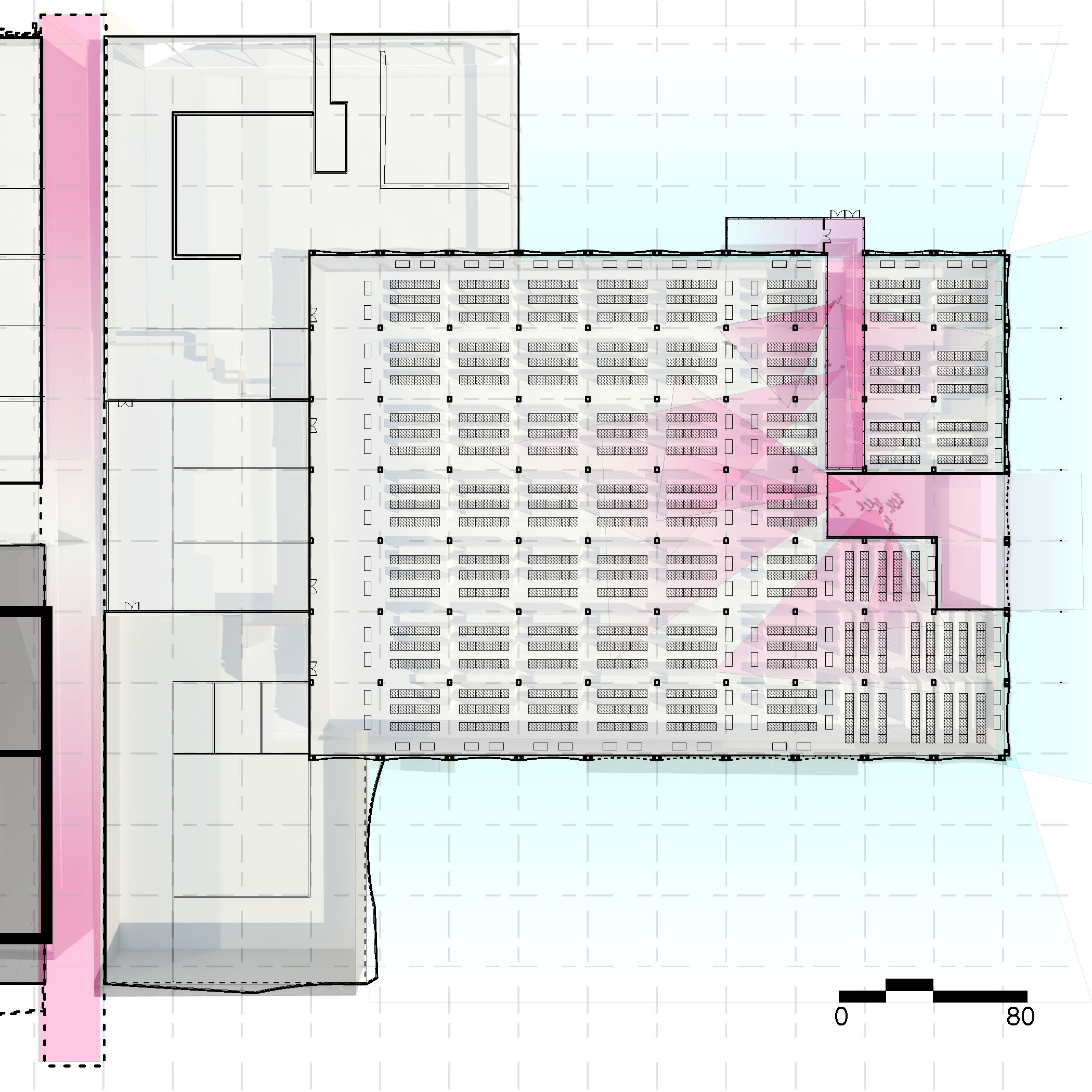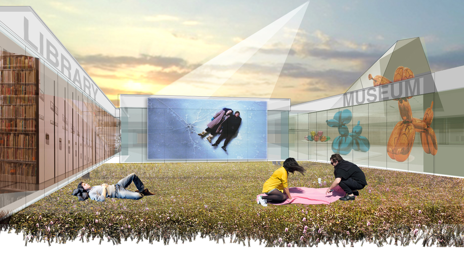 The park also starts to break down the scale of the massive building block, creating pockets that invite people to visually interact with the stored items housed in the building. These areas become “living rooms,” creating communal spaces for projection, recreation, performance, meeting and open-air shelter.