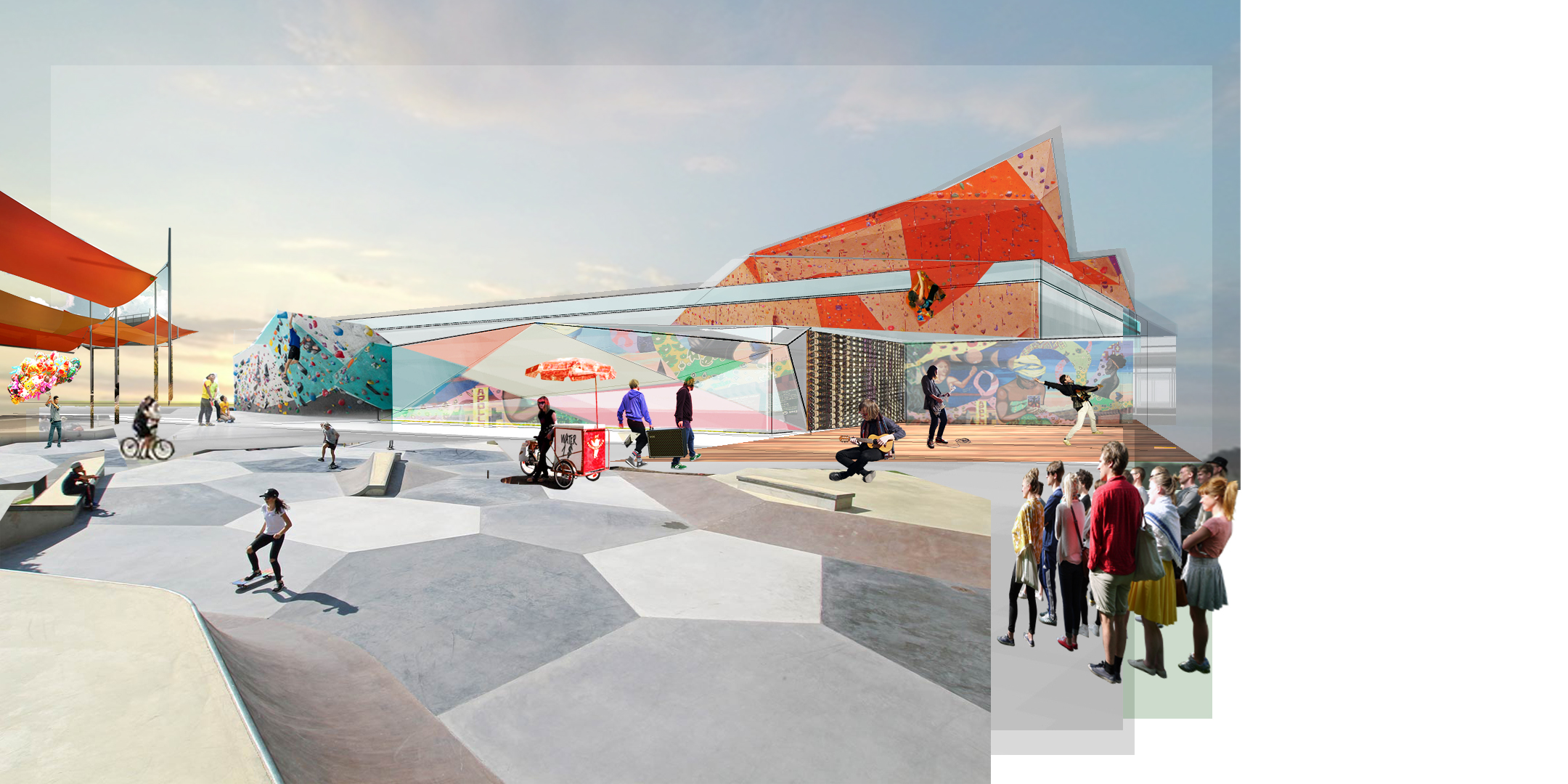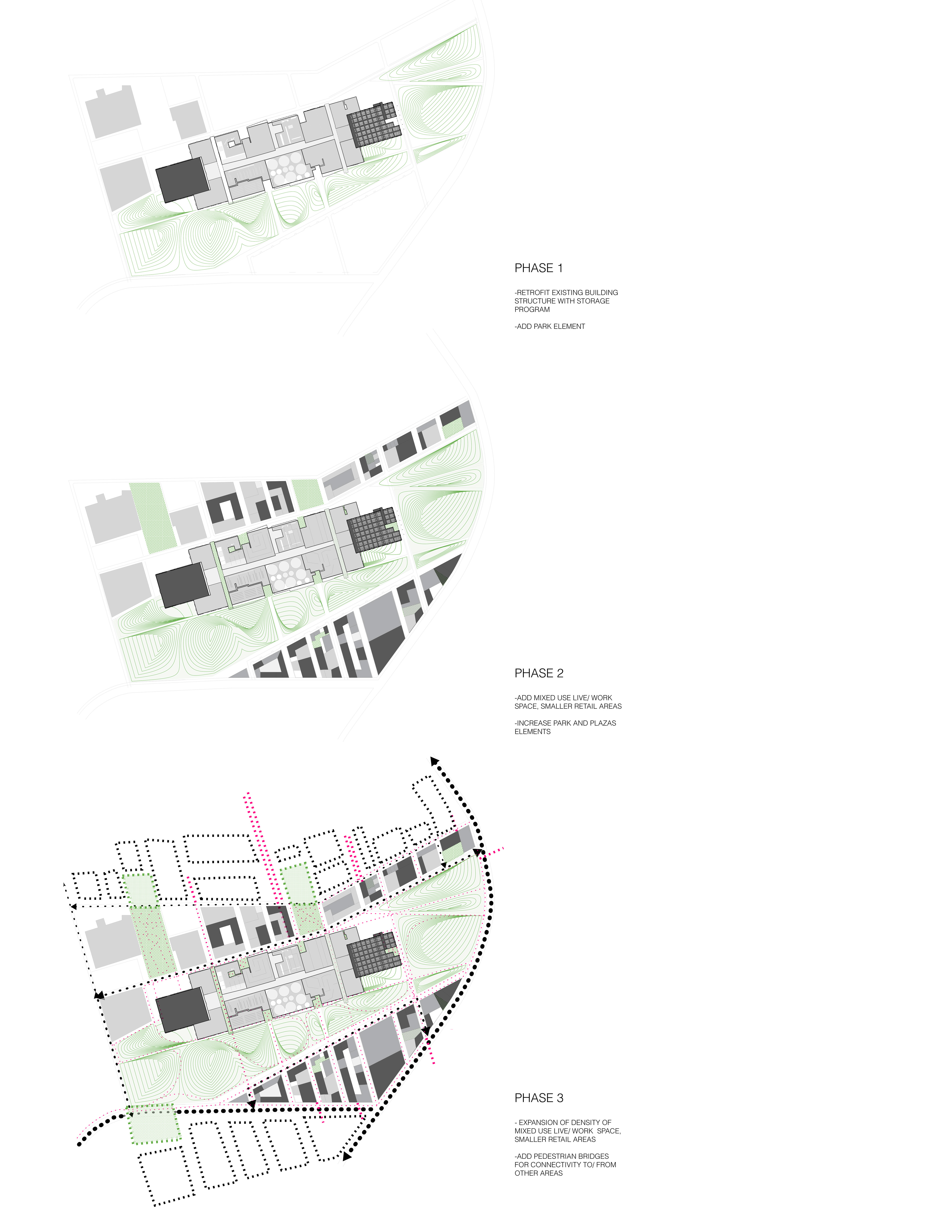 The Storehouse is a place that attracts people to a previously underused relic of a structure by creating an experience – a large park with recreational amenities and gathering spaces. By densifying the park’s periphery with mixed use live/work and retail spaces, the site becomes both a feasible profit-generator and begins to meld with its surrounding fabric.